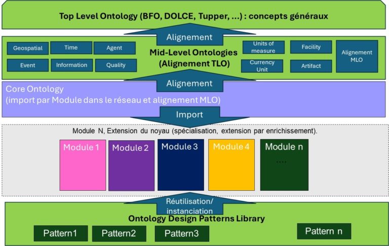 La réponse réside en organisant l’architecture de niveau inférieur autour d’un noyau ontologique minimal (Core Ontology) capturant les entités et relations de sens commun, strictement nécessaires à l’interopérabilité, mais dénué de toute spécificité métier excessive. Ce noyau remplit deux fonctions : servir de point d’ancrage sémantique commun à toute la suite, et assurer l’alignement avec les ontologies de niveau intermédiaire. Il constitue ainsi le pivot de la construction du réseau d’ontologies (au sens du projet NeOn) du domaine, réseau composé de modules de spécialisation, chacun développé par une communauté d’experts pour couvrir un cas d’usage précis ou un sous-domaine technique et chacun important le noyau.