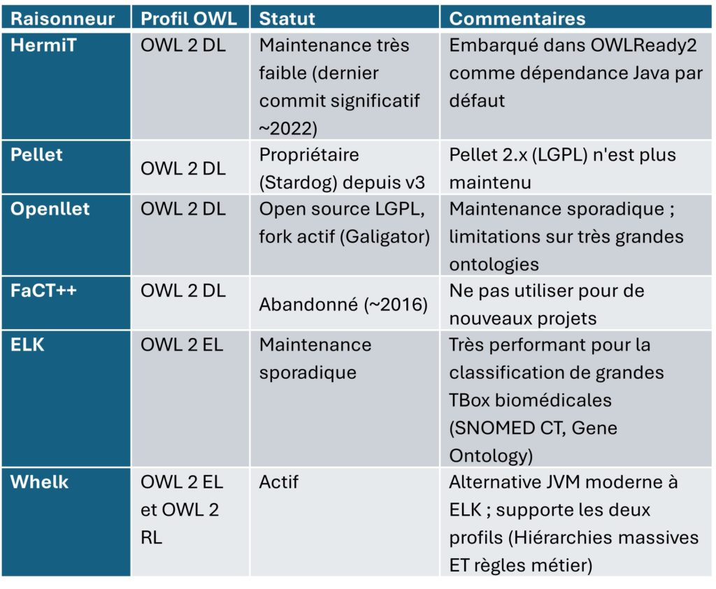 Cet article distingue trois niveaux : la couche sémantique BI (mapping de données), l’ontologie formelle avec son raisonneur (validation logique), et les moteurs d’inférence à grande échelle (traitement des instances). Il examine pour chacun des outils disponibles en 2026, leur état de maintenance si nécessaire, et leurs limites respectives.